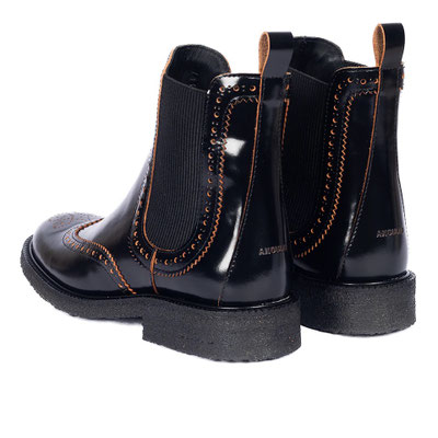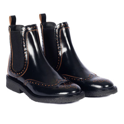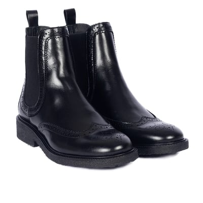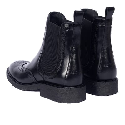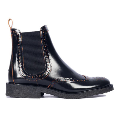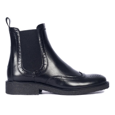 Chelsea leather boot with decorative brogue pattern. The boot features an almond-shaped toe, padded insole, chrome-free leather lining, embossed logo at heel, short shaft with heel strap and functional ribbed elastic, and a soft and flexible black crepe rubber sole in renewable natural rubber with a decorative trim. Crafted in natural and breathable leather. Designed in Denmark and handcrafted with love in Portugal.
