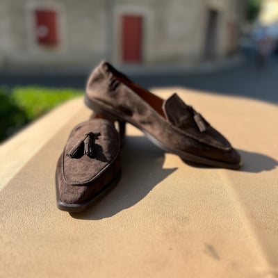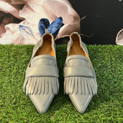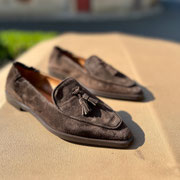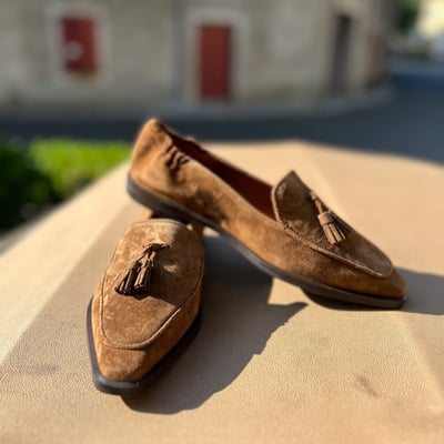 Billi Bi's handcrafted loafer with tassels is crafted in suede leather with a pointy toe. The loafer is decorated with two tassels on the front and an elastic heel cap at the back that ensures optimal comfort.