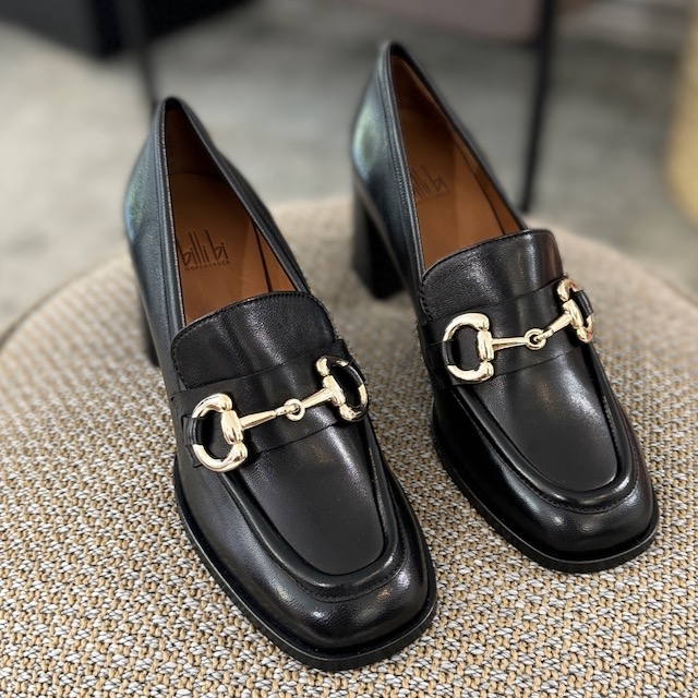 Billi Bi's heeled loafers are handcrafted in black soft leather and feature a round toe. They are decorated with a strap and a gold buckle across the front. The block heel is made for extra walking comfort.