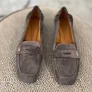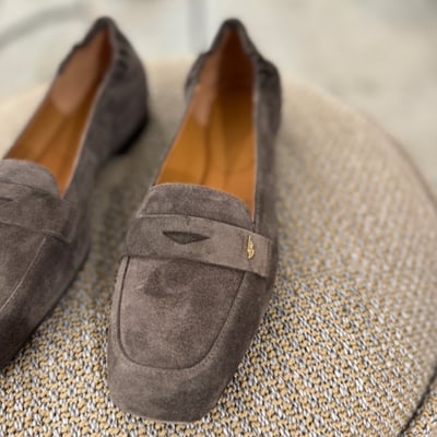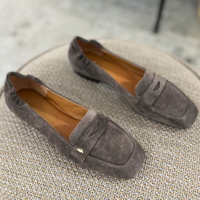 Billi Bi's loafer are handcrafted in soft grey suede. The shoe has a square toe and a decorative cut-out across the front. The shoe also has an elastic heel cap for extra comfort.