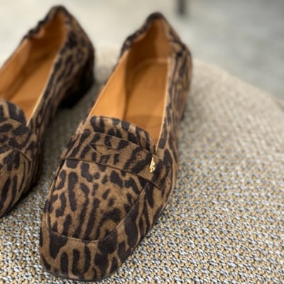 Billi Bi's loafer are handcrafted in suede with a leopard pattern. The shoe has a square toe and a decorative cut-out across the front. The shoe also has an elastic heel cap for extra comfort.
