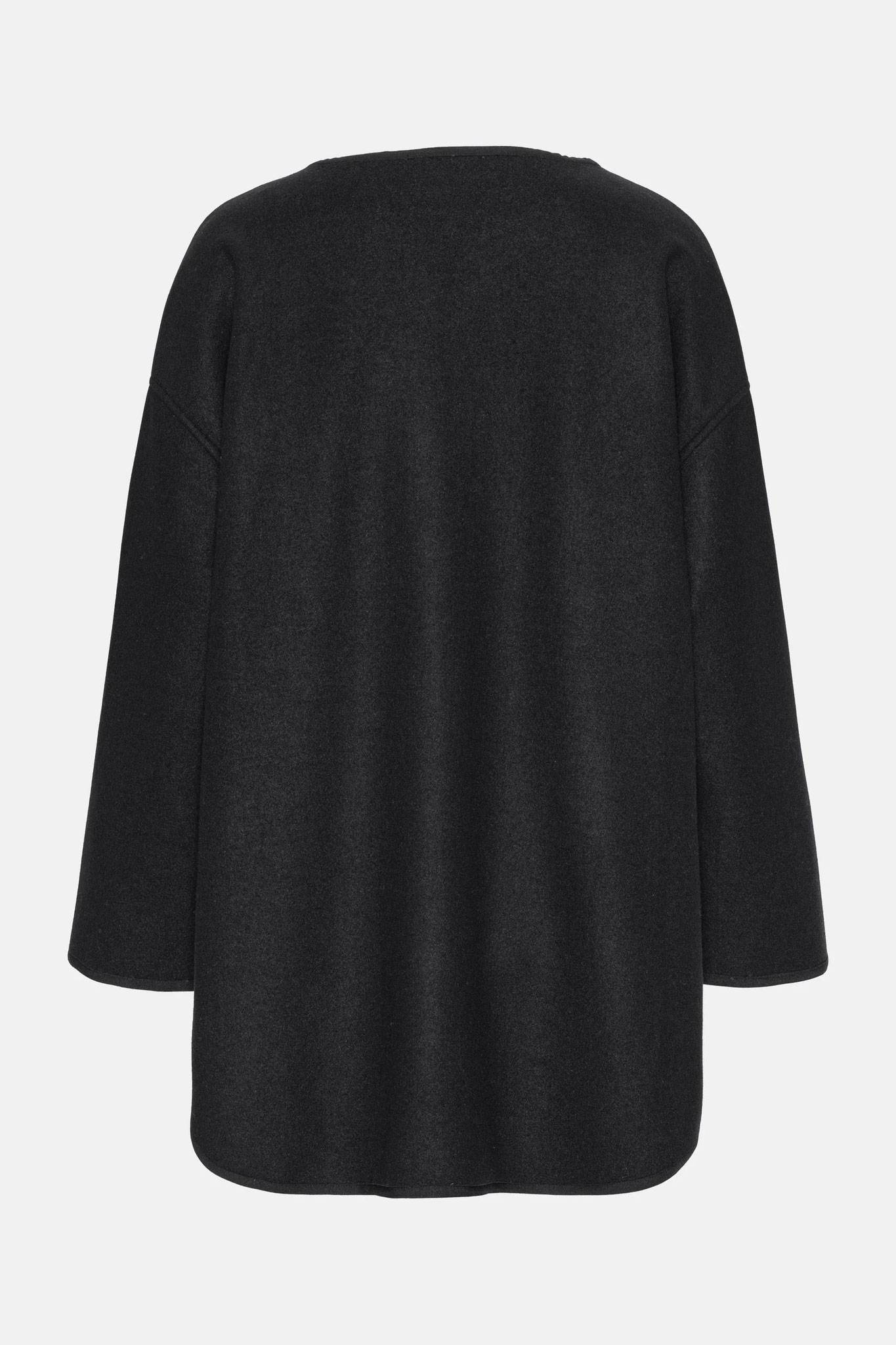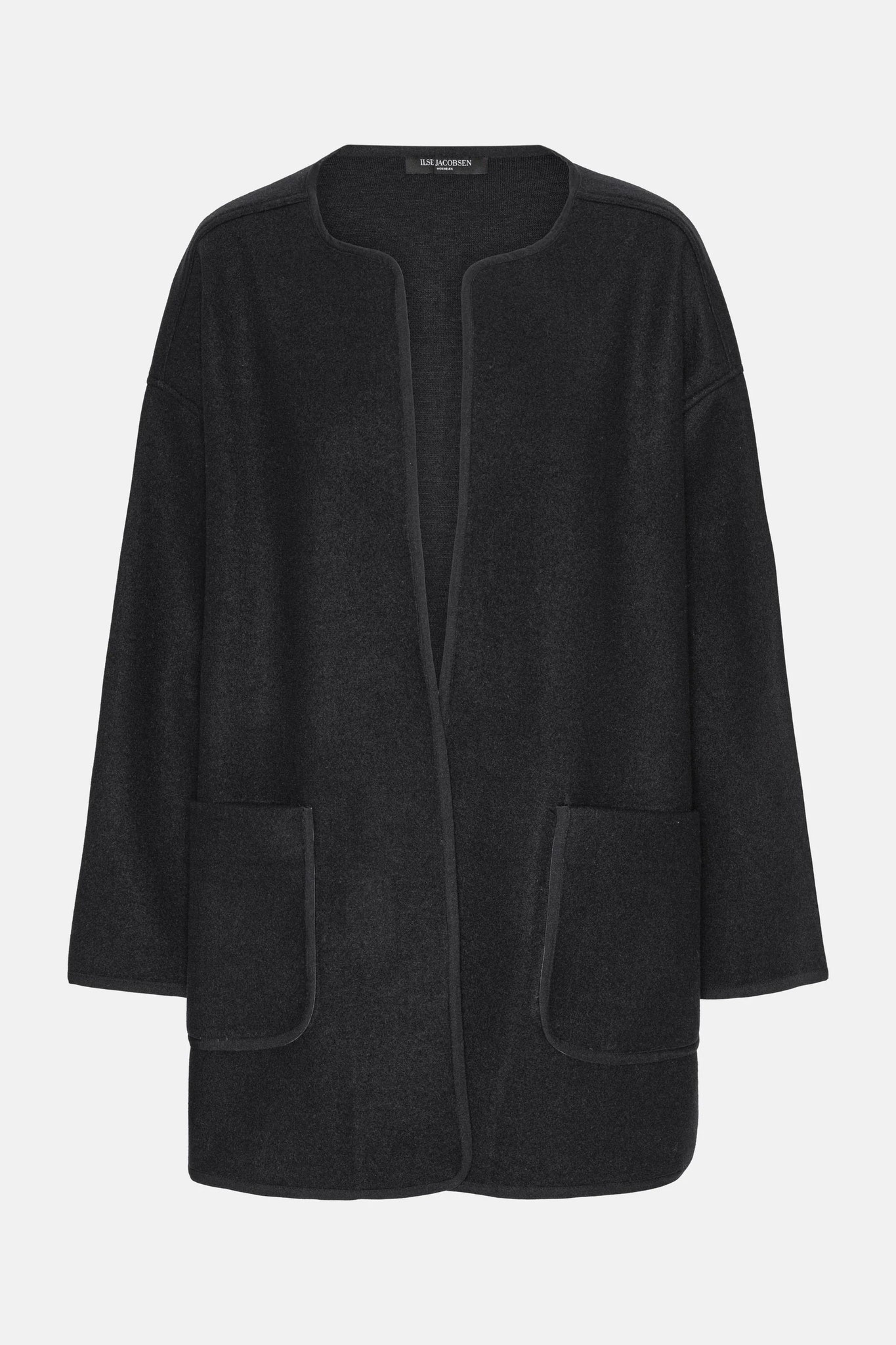 A soft felted jacket with a relaxed look and timeless feel. Designed with large patch pockets and finished with jersey binding at the hem, cuffs, and front placket for a clean, modern edge. The soft inner jersey lining adds comfort, while dropped shoulders and small side slits offer ease of movement. Fastened with a hidden hook and bar closure at the front, this piece is effortlessly versatile across seasons.
