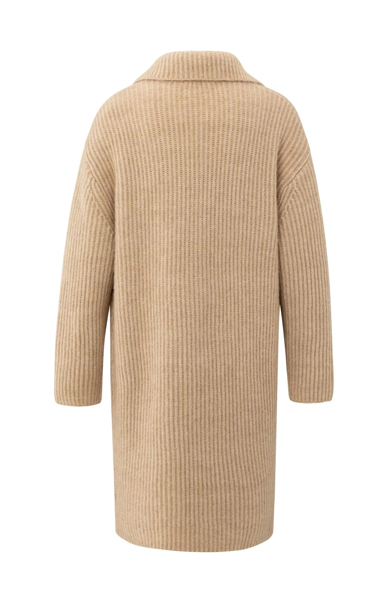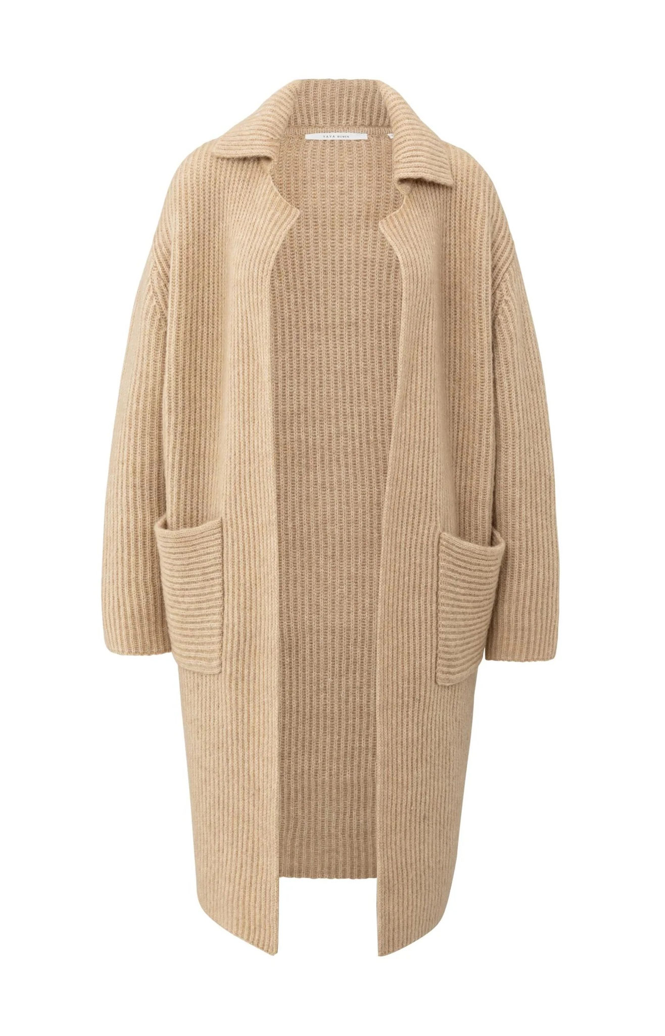This long cardigan is crafted from a soft wool blend in a chunky knit and features a relaxed fit with dropped shoulders. Designed with a classic collar, open front, and two large patch pockets. The ribbed texture adds warmth and a modern touch.