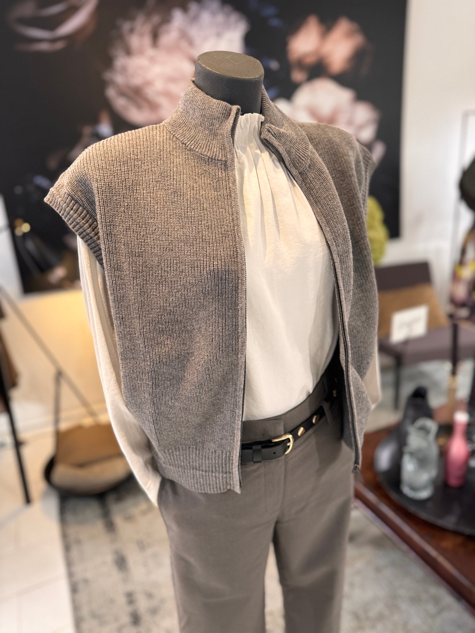 This chunky knitted sleeveless cardigan is made from a soft wool blend and features a straight fit. Designed with a high stand-up collar and a full-length zipper, it offers a modern and effortless layering option. The wide ribbed trims add a contemporary touch.