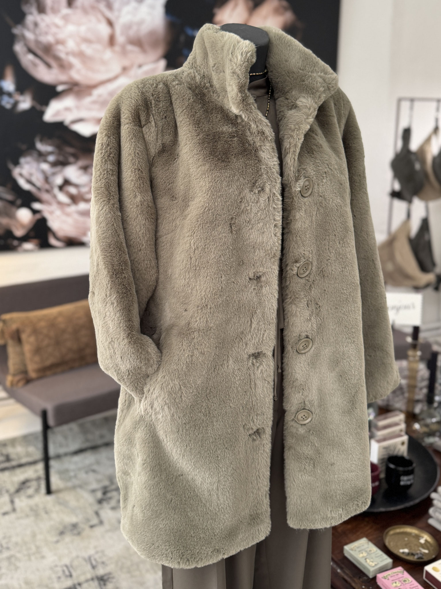 The Nonna coat has a medium-length cut with a high neck collar, button up fastening and two hidden pockets on the sides. It's the perfect piece to snuggle up in and feel warm and stylish. You won't want to take this coat off. The 'Real faux' label on the sleeve can be removed.
