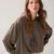 This wide-fit top in soft, shiny fabric has a deep slit with a bow fastening at the chest and a button on the stand-up collar. The top has a lowered sleeve inset, wide buttoned cuffs and a gathered back panel.