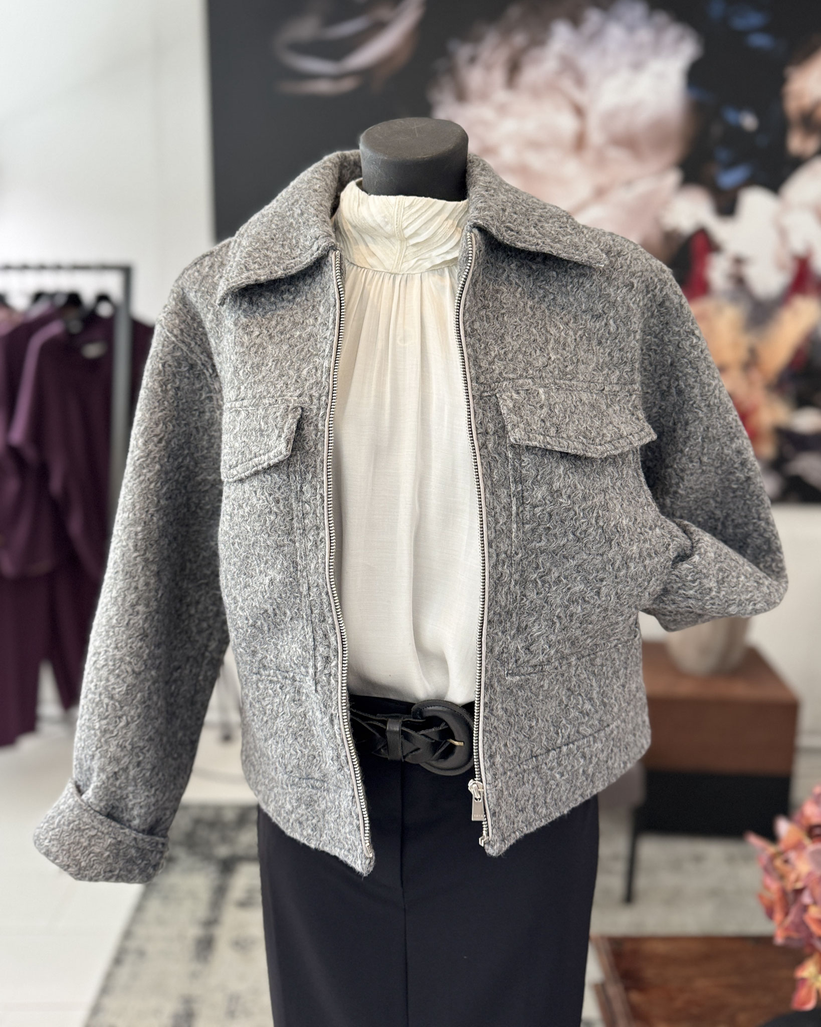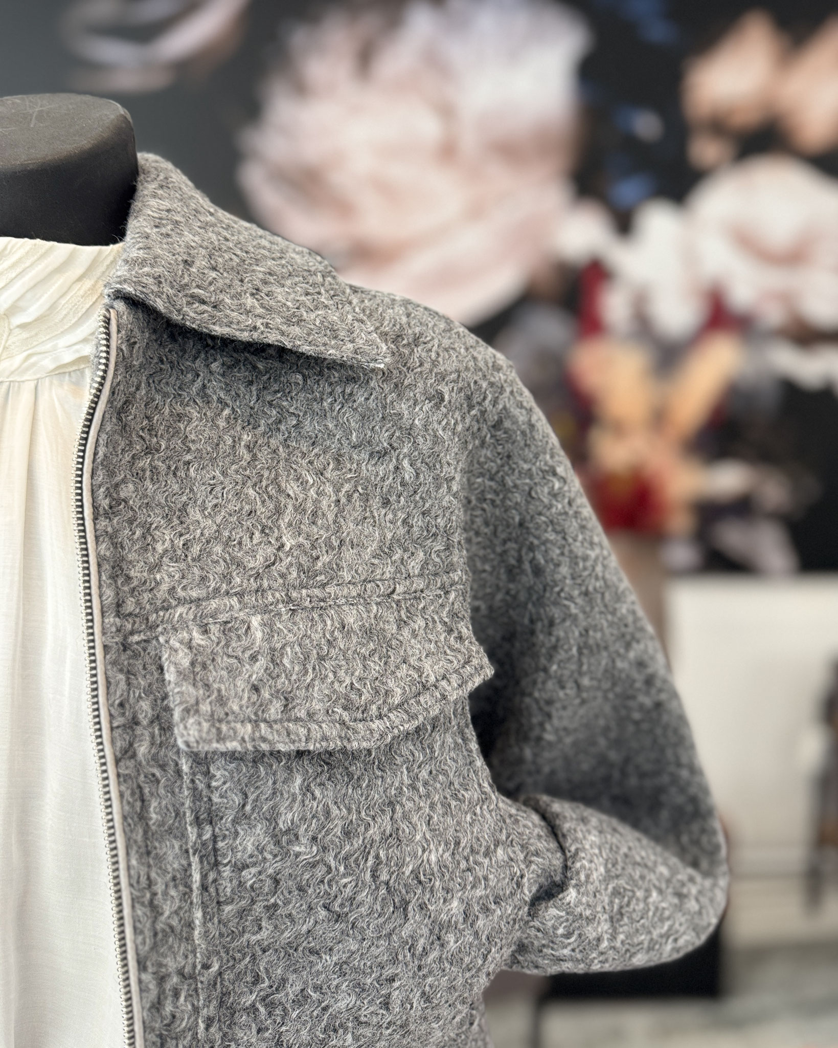 This short jacket is crafted from a soft bouclé fabric and features a loose fit. Designed with a stand-up collar with ribbed detail, front zip closure and flap chest pockets. The textured surface adds a rich feel and effortless look. Perfect for a warm and contemporary outfit.